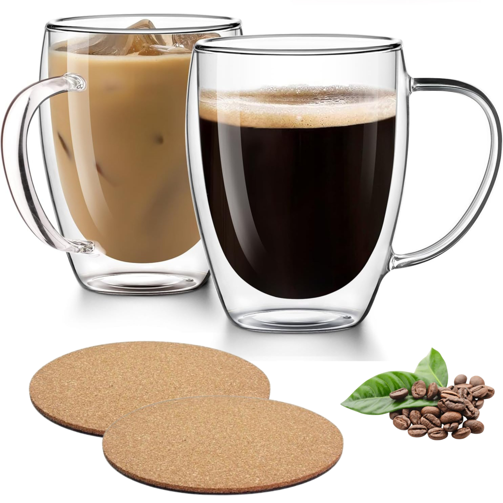 Pahar cu pereti dubli cu maner, 150 ml, din sticla borosilicata premium termorezistenta, design modern transparent, cana cafea si ceai rezistenta. Suport din pluta inclus in set.