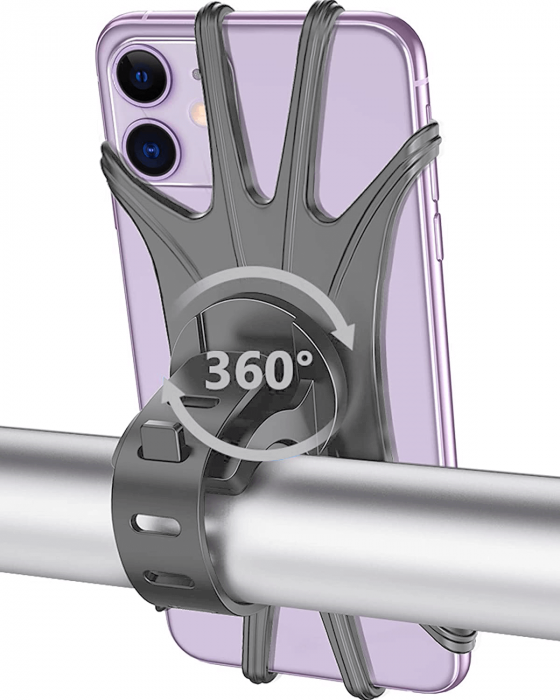 Suport telefon universal pentru bicicleta, din silicon, rotativ 360⁰, montaj pe ghidon, compatibil bicicleta, carut, trotineta, scuter, gri