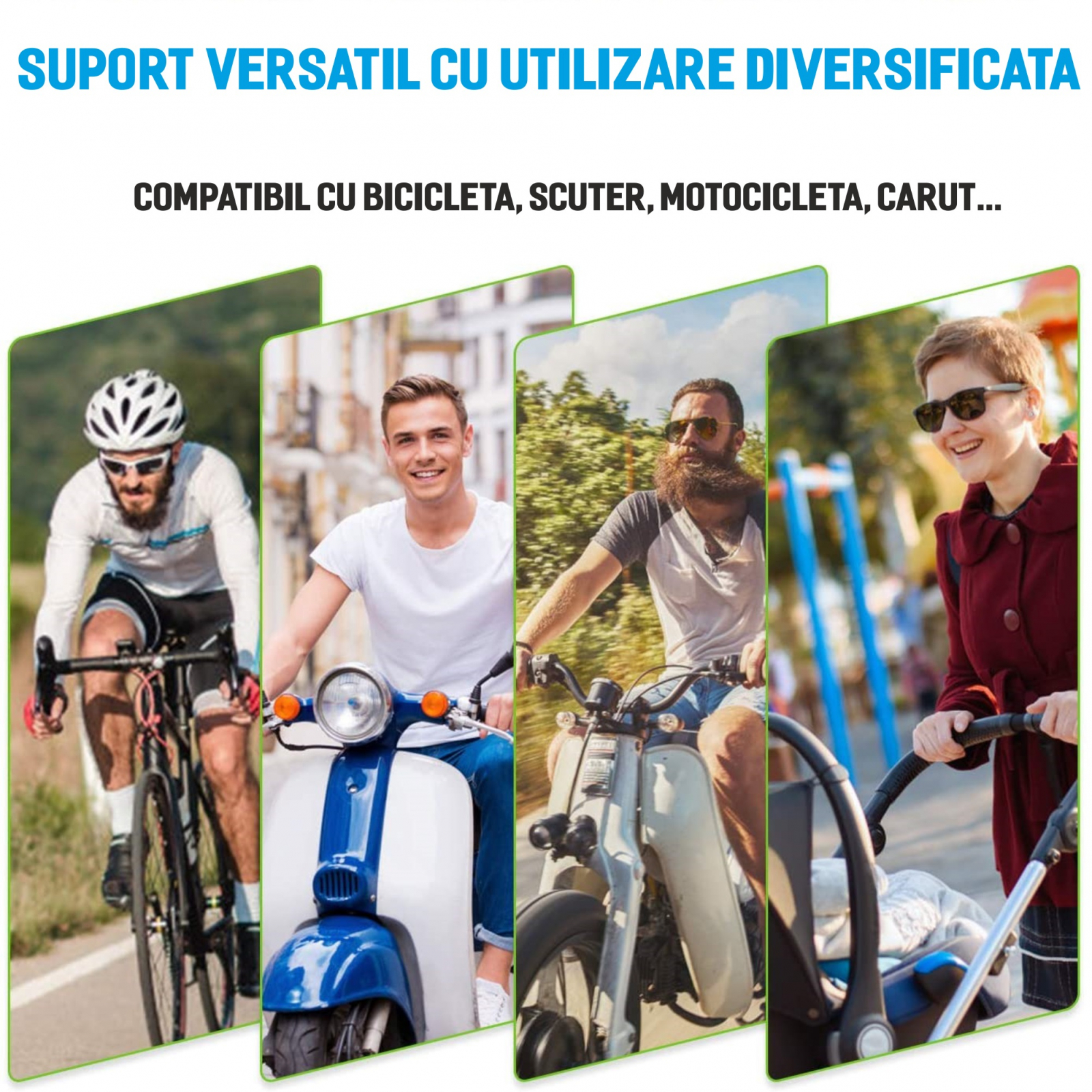 • Se poate monta pe ghidonul bicicletei sau pe manerul carutului.
